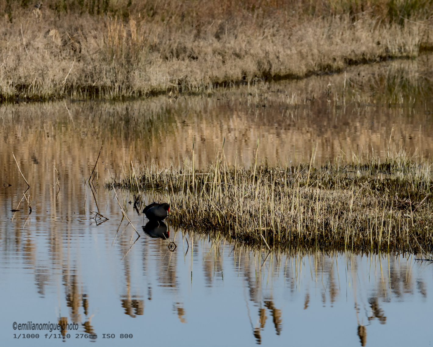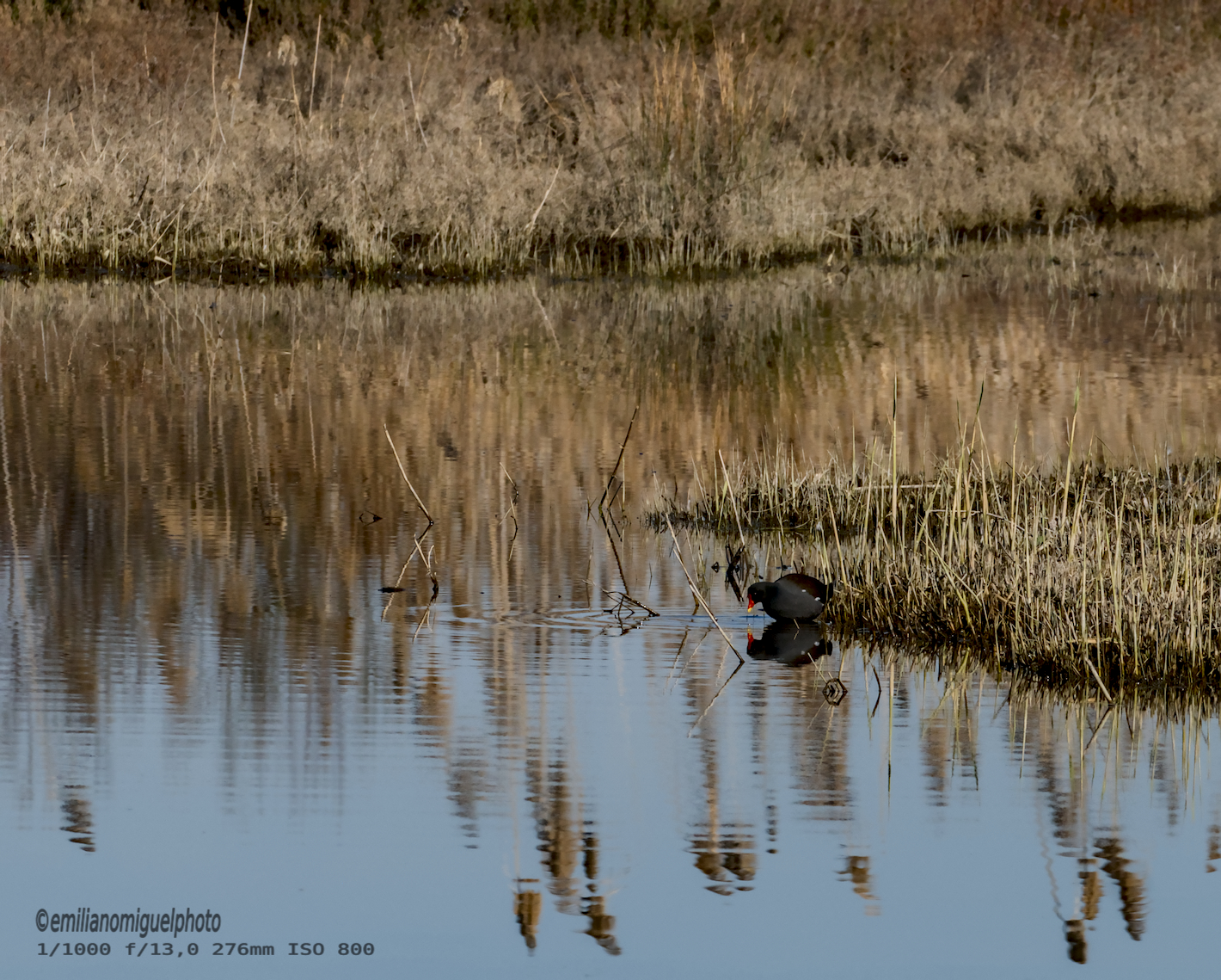 La gallineta común o polla de agua (Gallinula chloropus) es una especie de ave gruiforme de la familia Rallidae que habita en Eurasia y África.Es una especie inconfundible en su entorno. Es una rállida de tamaño medio, que mide entre 30 y 38 cm y tiene una envergadura alar de 50 a 62 cm. Su peso puede oscilar entre 192 y 500 g. La coloración general de su plumaje es gris negruzca, con la cabeza y el cuello más oscuros, salvo la zona bajo la cola que es blanca, y sendas franjas también blancas que atraviesan transversalmente sus flancos. Su pico es rojo, al igual que el escudo facial, excepto en la punta que es amarilla. Su escudo facial es redondeado en la parte superior mientras que sus laterales son rectos y bastante paralelos, comparándolo con el escudo frontal de las gallinetas americanas que se estrecha más al juntarse con el pico y tiene la parte superior más recta. Sus patas son de color amarillo verdoso, con una mancha roja en las rodillas. Tienen unos dedos muy largos que carecen de los lóbulos de las fochas y cualquier membrana interdigital, adaptados para andar sobre la vegetación acuática. Los juveniles son de tonos parduzcos y carecen del escudo facial rojo. Wikipedia