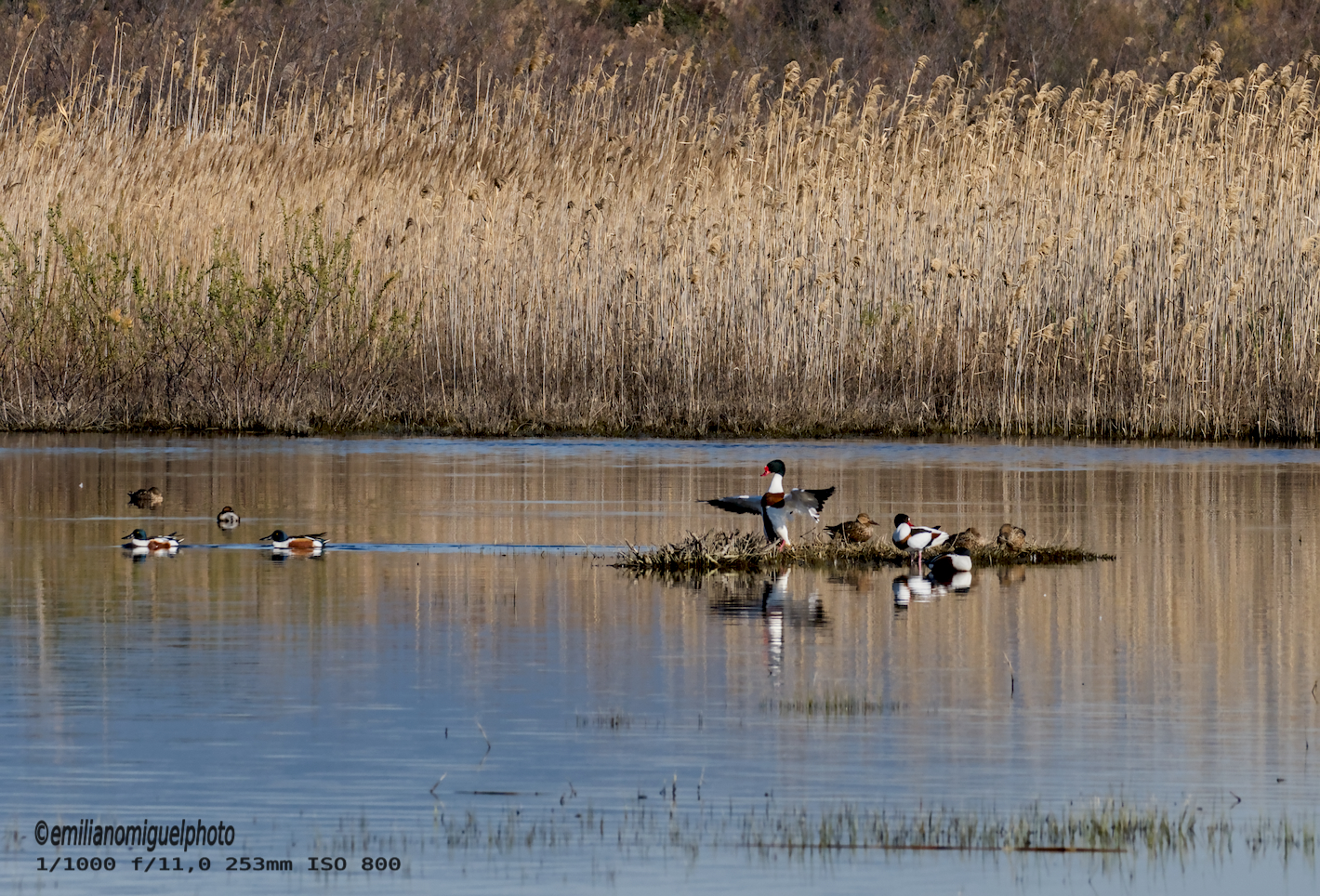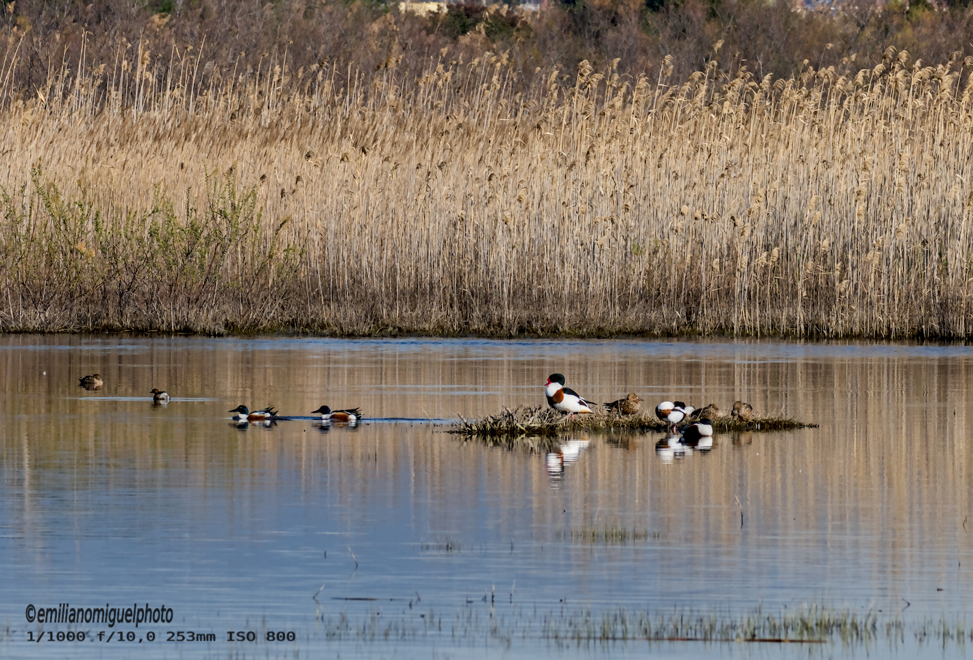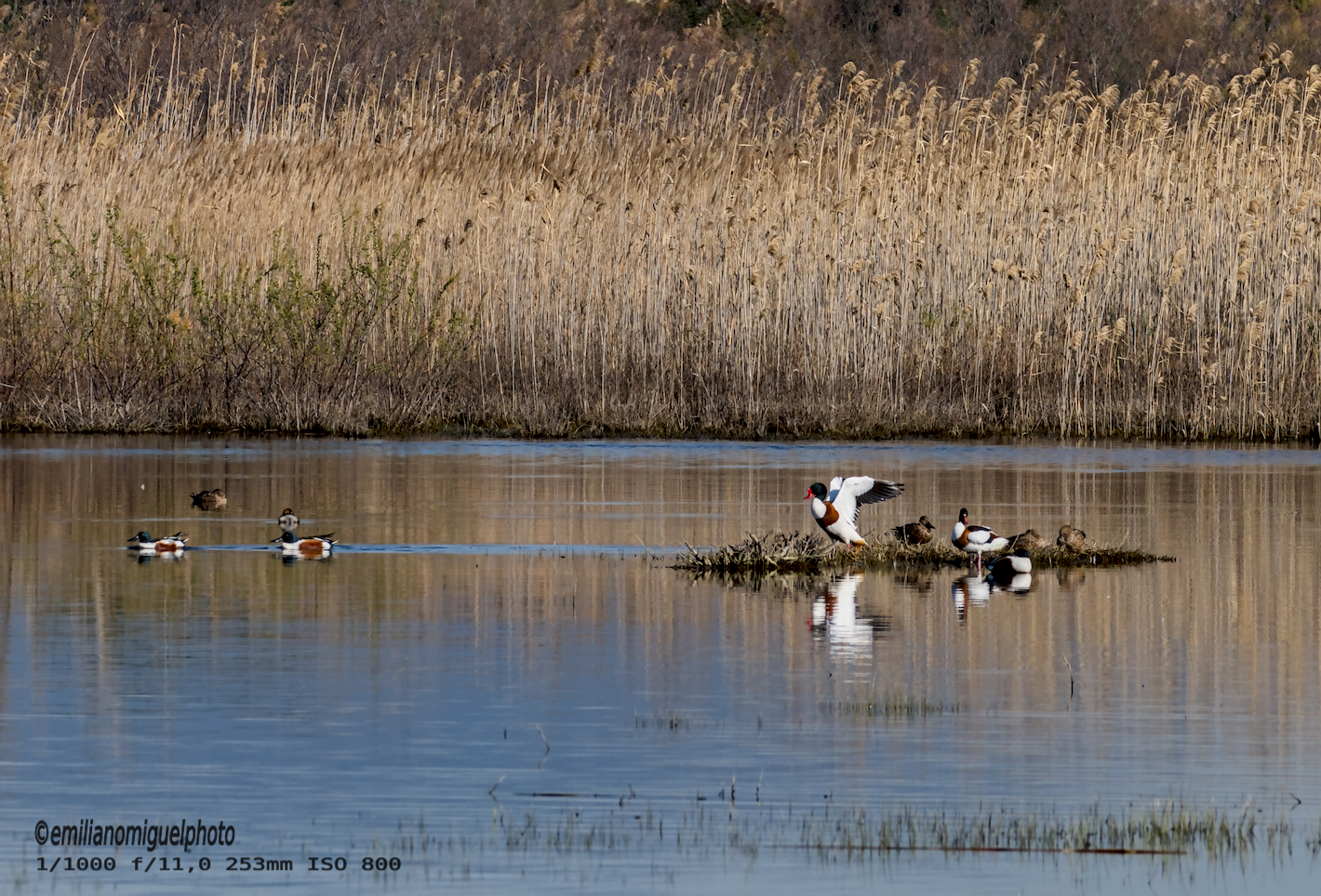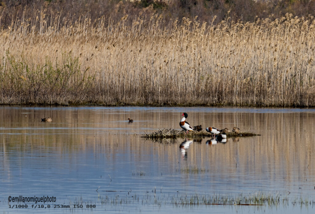 El tarro blanco (Tadorna tadorna) es una especie de ave anseriforme de la familia Anatidae. Es un pato común y ampliamente extendido en Eurasia y el norte de África. l tarro blanco es una ave llamativa con aspecto intermedio entre pato y ganso. Su plumaje es principalmente blanco con zonas negras y de color castaño rojizo. Tiene la cabeza y la parte superior del cuello negras con irisaciones verdes. Presenta una ancha franja pectoral de color castaño rojizo que también rodea el manto. Presenta zonas de plumaje negro en la línea del vientre, la punta de la cola, dos franjas escapulares y las rémiges (excepto las secundarias interiores que también son castañas). También presenta una mancha de color canela herrumbroso en la zona infracaudal de bordes difusos. Su pico es rojo y sus patas son rosadas. Ambos sexos son similares, pero el macho presenta una protuberancia en la base del pico a modo de escudo frontal que junto con el pico incrementa la intensidad de su color en la época reproductora. Las hembras tienen la franja pectoral más estrecha y presentan cierto moteado facial blanco. Los juveniles carecen de la franja pectoral y el rostro manchado de blanco. Wikipedia