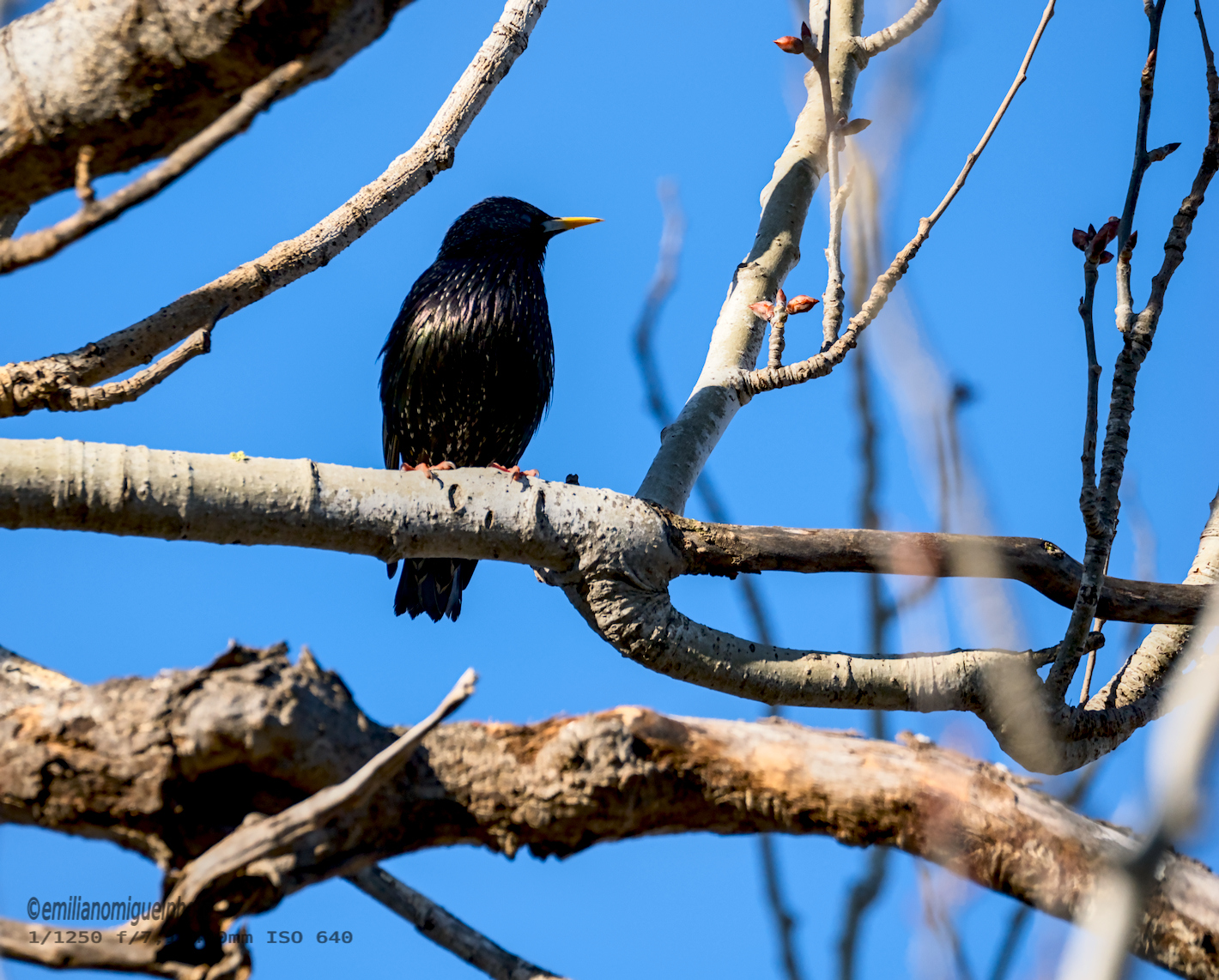 El estornino pinto (Sturnus vulgaris), también conocido como estornino europeo o estornino común, es una especie de ave paseriforme de la familia Sturnidae nativa del Paleártico. Mide unos 20 cm de largo y tiene un plumaje de color negro iridiscente, con un brillo púrpura o verde, salpicado de blanco, sobre todo en el invierno. Las patas son rojizas, y el pico es negro en el invierno y amarillo en el verano. A diferencia de los adultos, las aves juveniles tienen un plumaje marrón. Es un ave ruidosa, sobre todo en perchas comunitarias y otras situaciones gregarias, y tiene un canto variado, pero poco musical. Tiene la capacidad de imitar los sonidos de su entorno e incluso aprenderlos. Su talento para la imitación vocal ha sido notado en obras literarias como el Mabinogion y las obras de Plinio el Viejo y William Shakespeare. Wikipedia